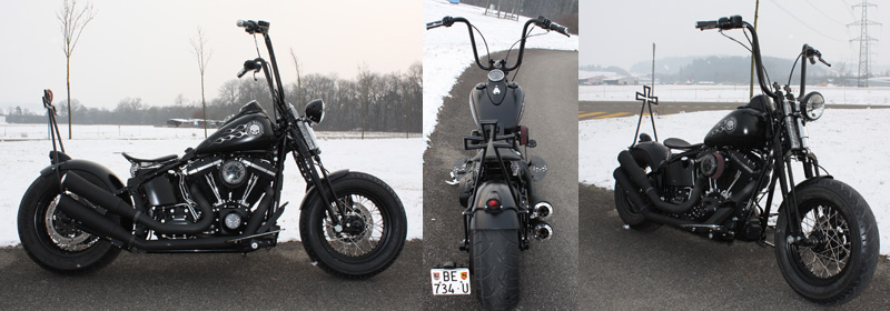 Dark Bones 30mm Lenker und Riser wie üblich aus dem Hause Twin Tec. Fussbretter, Bremshebel, Derby- und Zündungsdeckel sowie der seitliche Kennzeichenhalter kommen auch aus der Twin Tec Skull-Serie. Das Vorderrad wurde original belassen und zusammen mit dem 6*16er Hinterrad und dem Oeltank - ohne den zarten Willy G. Skull - matt beschichtet. Die Fender kommen von SCP, die Auspuffanlage von KessTech. Malteser-Sissybar, Satel plus Abdeckung und die Lampentieferlegung wieder von uns. Ein paar mehr Details: D1 |