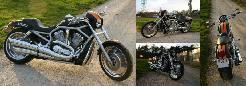 VRSCA - Strom - mittig laufendes 240er Hinterrad auf verbreiterter Felge in original Schwinge und Heck - Black/Orange Strom-Design - Kellermann Barend-Blinker vorne, Bullet Blinker hinten - Screamin' Eagle Endschalldämpfer |